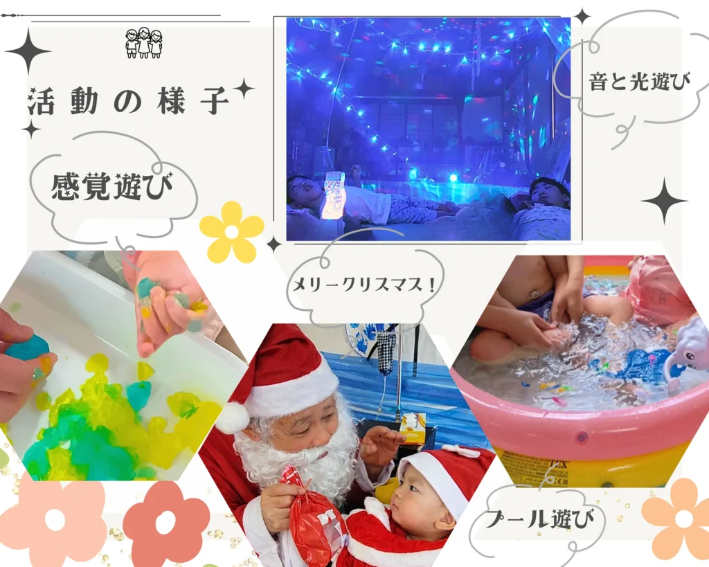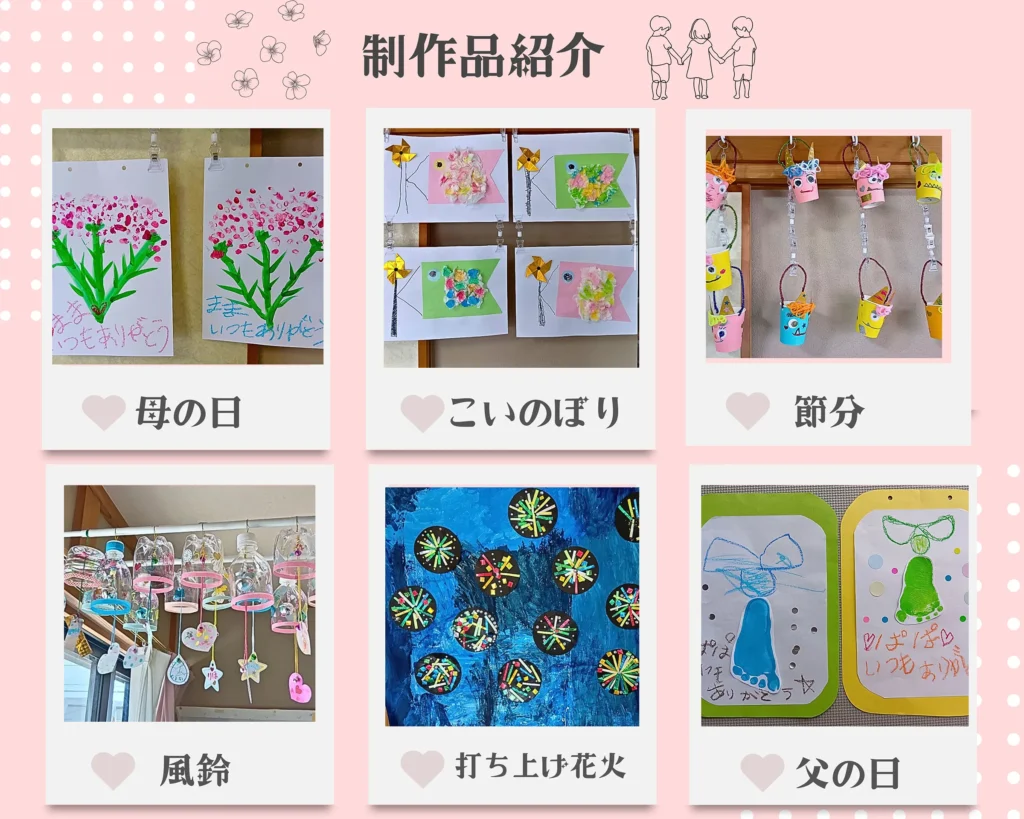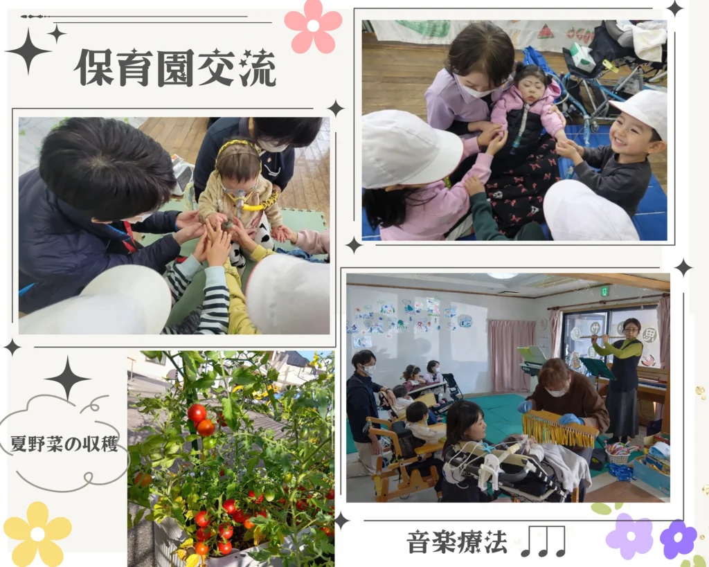 このような活動を中心に季節のイベントや工作などの療育を提供し、また医療ケア・リハビリ・療育の3本の柱でお子様の集団生活への適応、他児との交流促進につながるよう支援いたします。