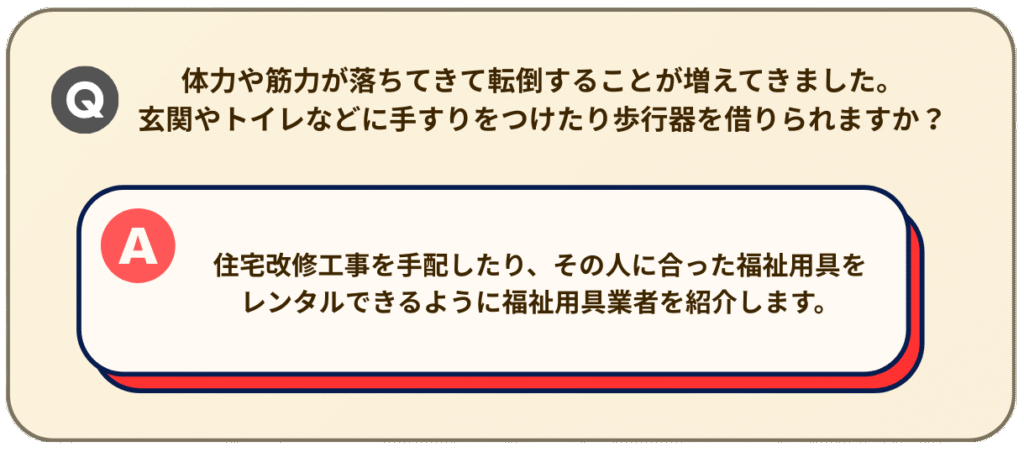 ご自宅での生活を維持するため必要な住宅改修、福祉用具・介護用具のご紹介やアドバイスをします。